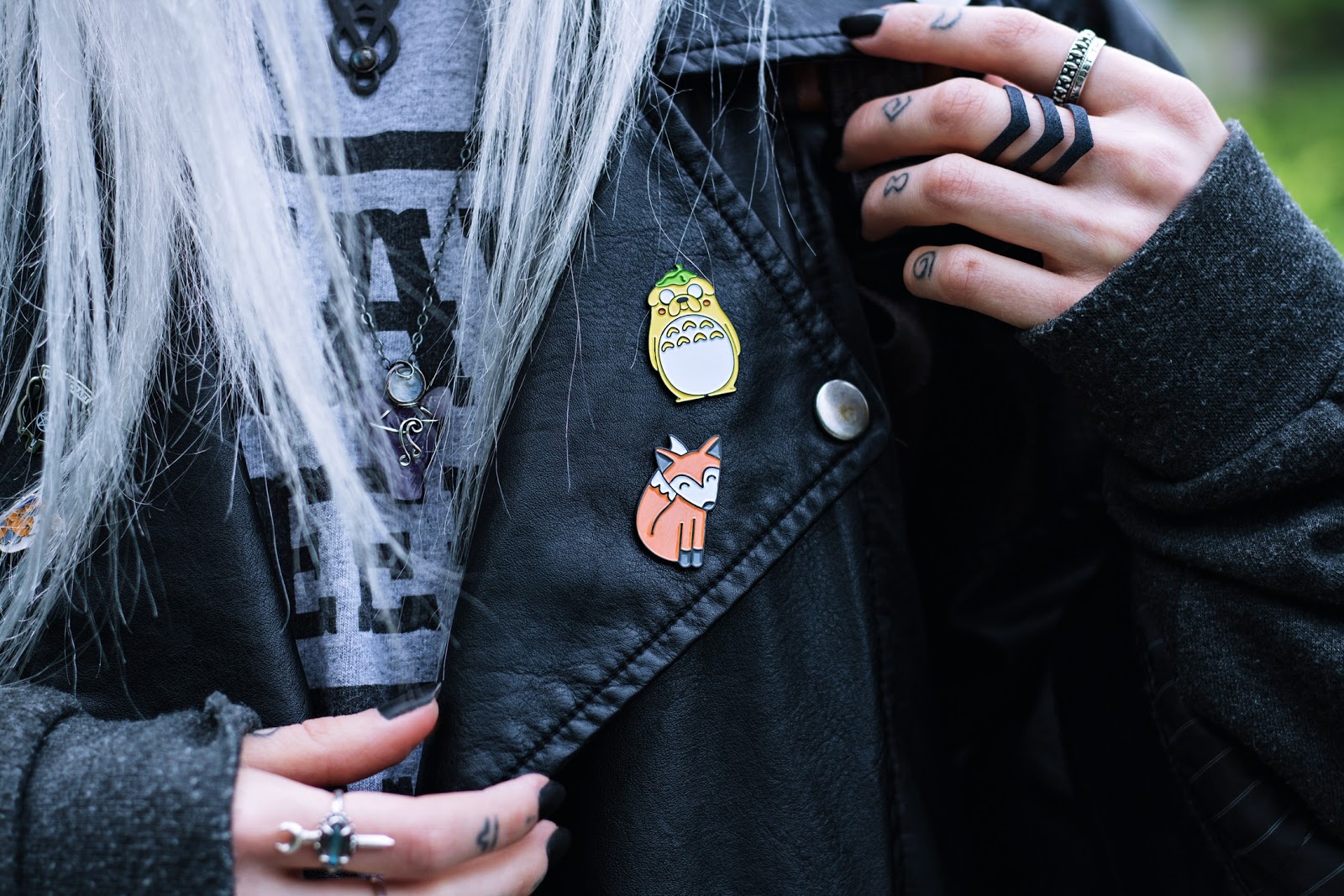 I'm getting so much questions about my black leather jacket all the time. Not only because it looks so super casual and comfy, this oversized look where you can still wear loads of layers underneath but it is vegan material, yet super soft and not cheap looking! I've got myself a second one from the same brand called VII & Co now and simply love the details on this. The quality is the same just in grey with some nice additions like a chain and piercing rings on the collar. Of course my black one already got some cute pins. My favorites and newest ones are The Fox and the Jake Totoro Pin from The Sunday Co.